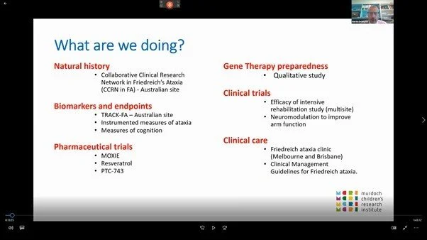 After Sherelle, Jen and Kara that I spoke of in my last note came Martin Delatycki who explained the work his group coordinates via the Murdoch Children’s Research Institute in Melbourne.